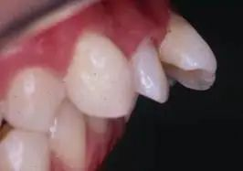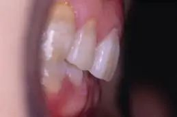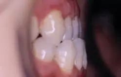 4、覆合過深:圖4 所示上前牙嚴(yán)重舌向傾斜,就是內(nèi)傾,當(dāng)上下頜牙齒咬合在一起時(shí),上牙將下牙完全蓋住,其美觀效果很差。如圖4所示.