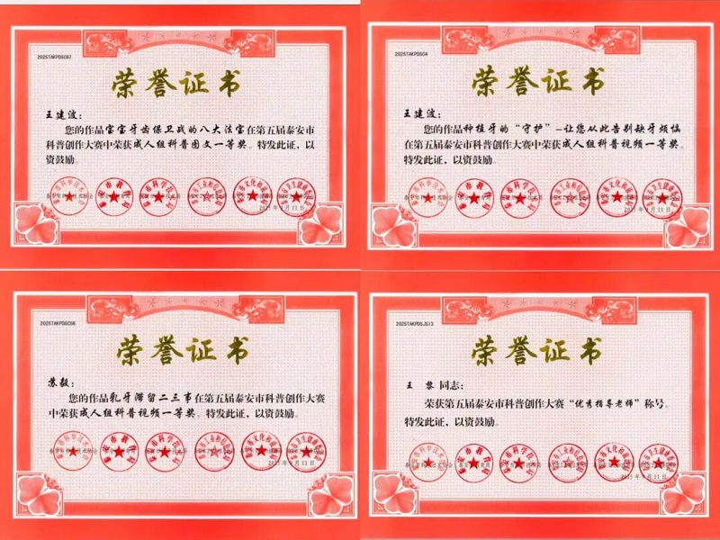 此次獲獎不僅是對獲獎個人工作和作品的肯定,更是對泰安市口腔醫(yī)院整體宣傳工作的認可。我們將以此為契機,更加積極地開展科普創(chuàng)作與宣傳,努力創(chuàng)作融科學(xué)性、知識性、藝術(shù)性為一體的優(yōu)秀作品,為弘揚科學(xué)精神、普及科學(xué)知識、服務(wù)全民科學(xué)素質(zhì)提升作出積極貢獻。